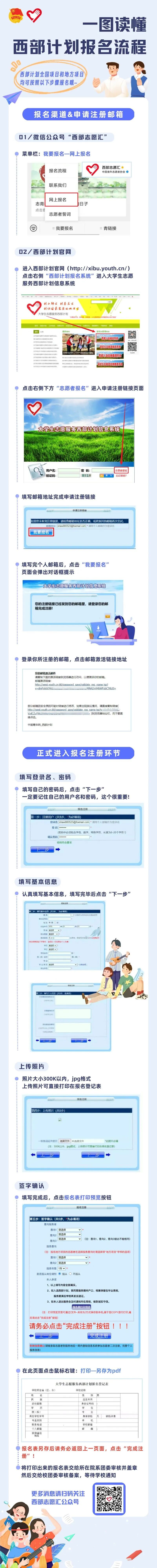 (1)可通过微信公众号“西部志愿汇”(菜单栏中的“我要报名”)或登录西部计划官网(http://xibu.youth.cn),在西部计划报名系统中进行注册报名、填写个人信息并选择意向服务省(重庆)。